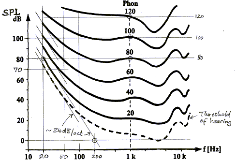 The importance of low distortion at very low frequencies can be deduced from the equal loudness contours. The threshold of hearing is around 70 dB SPL at 20 Hz. This is at the level of normal conversation. With increasing frequency the threshold drops rapidly. The loudness contours have an initial slope of 80 dB/dec, or 24 dB/oct, at low perceived volume levels (phon).
