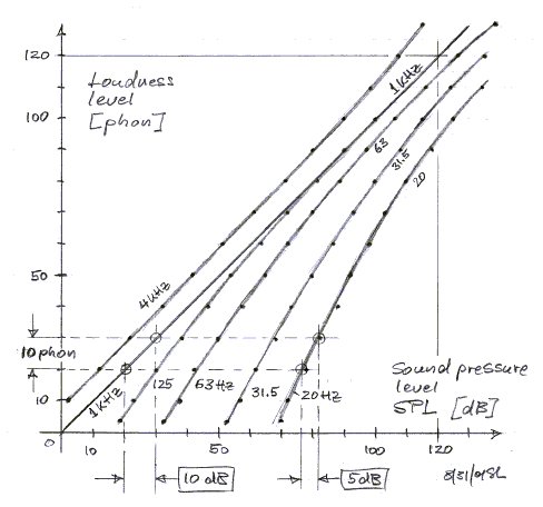 The equal loudness contours of the graph above are bunched more tightly together at low frequencies. Re-drawing such graph in terms of perceived loudness (phon) versus sound pressure level in dB SPL for different frequencies, it shows us the sensitivity we have to changes in low frequency level adjustment.