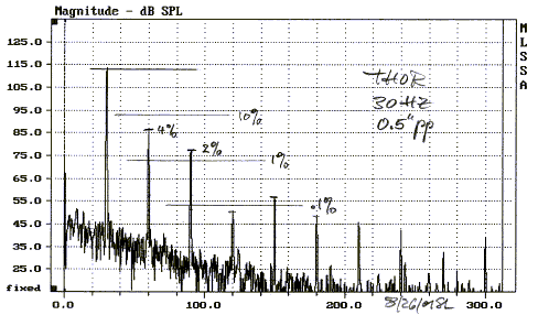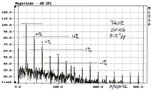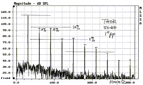 The non-linear behavior of a subwoofer increases rapidly as cone excursions become large, because force factor Bl, compliance Cms, and voice coil inductance Le, change with displacement from the resting position. Distortion also changes with frequency, even when the peak-to-peak displacement is held constant. This can be seen by comparing 30 Hz and 20 Hz harmonic distortion measurements of THOR for constant p-p excursion of 0.5" (13 mm).