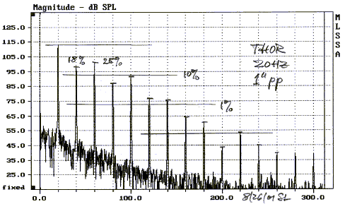 The large signal behavior of a driver and its effects upon the radiated sound quality are quite complicated. In the case of THOR one should not count on more than 0.5" excursion at 20 Hz or 0.75" p-p at 30 Hz. For accurate very low frequency reproduction it will almost always be necessary to place at least two THOR units in a room to obtain sufficiently low distortion levels.