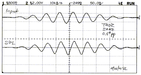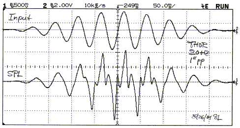 A 10-cycle shaped tone burst at 20 Hz with cosine envelope gives a picture of the time waveform distortion as the excursions build up to 1" p-p and then decrease towards zero.
